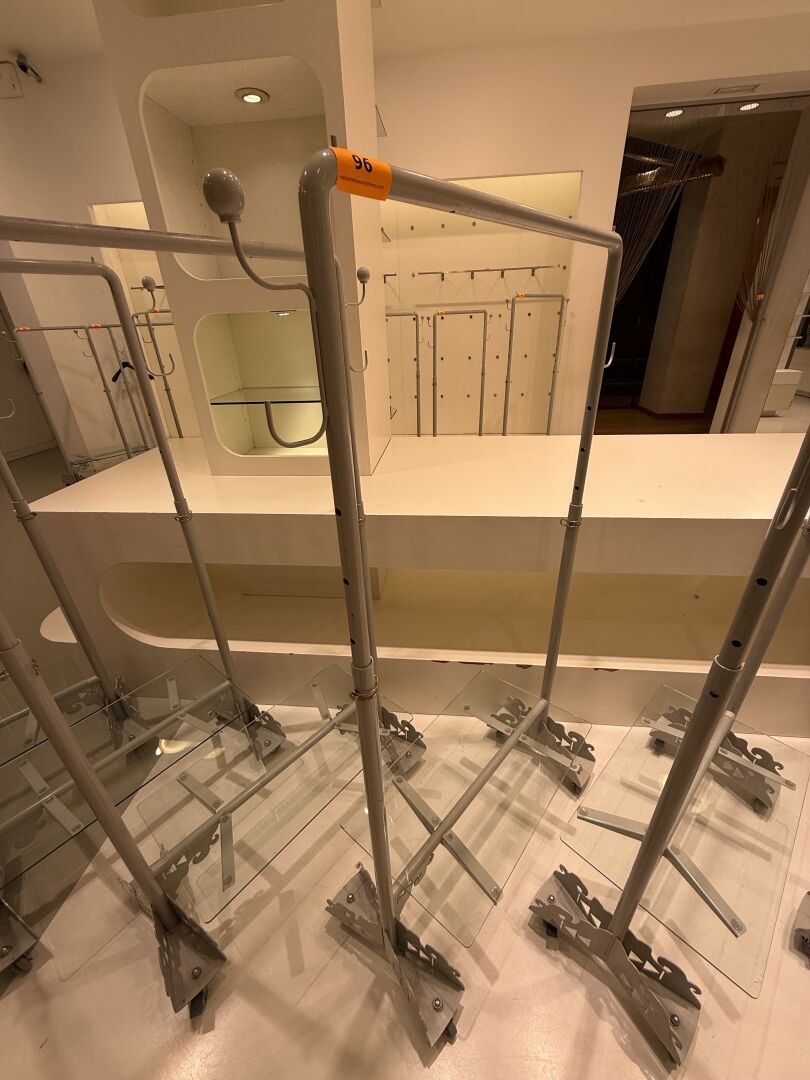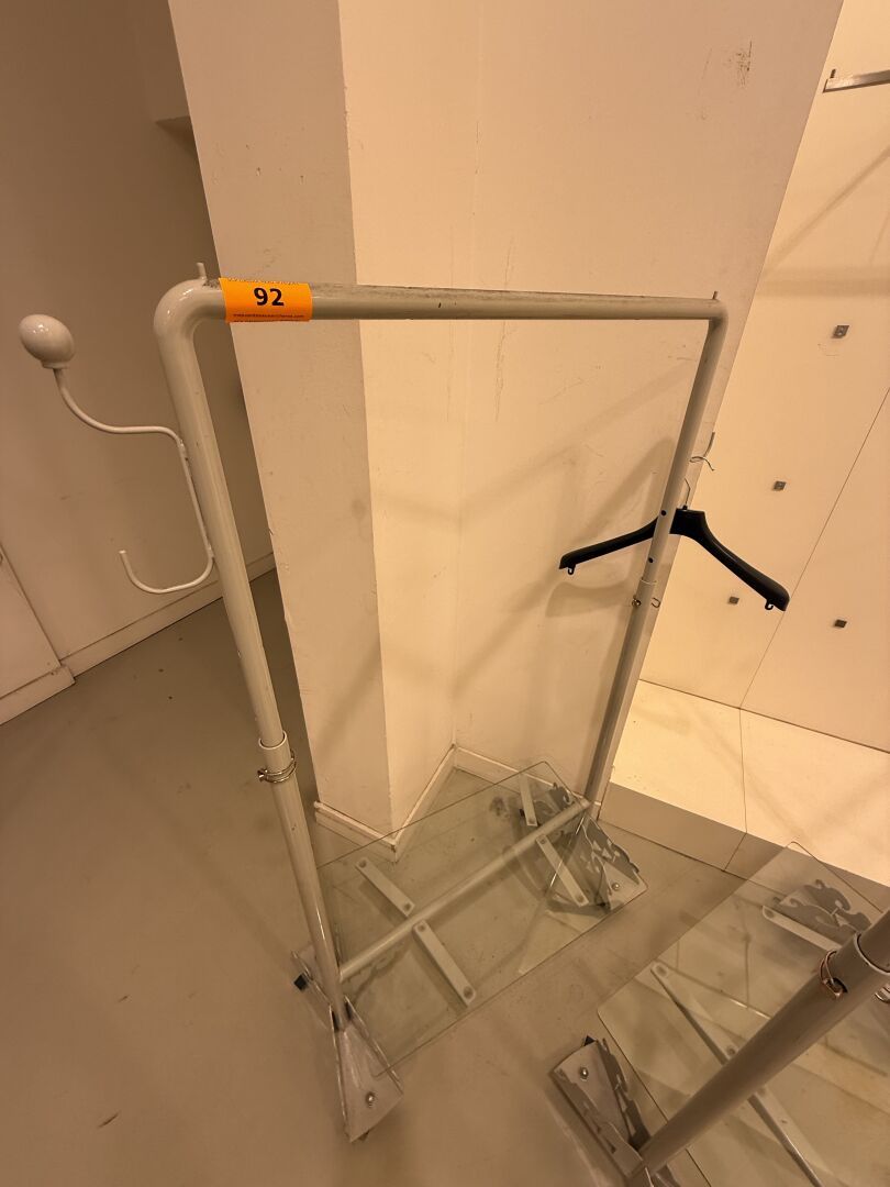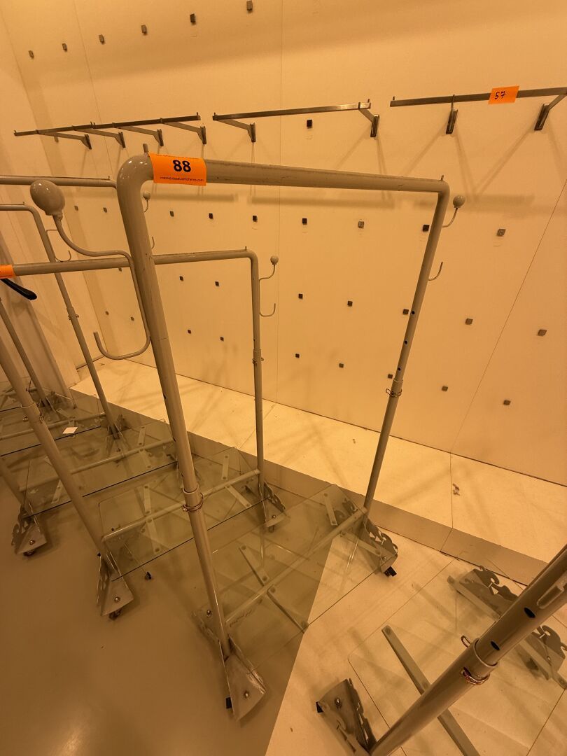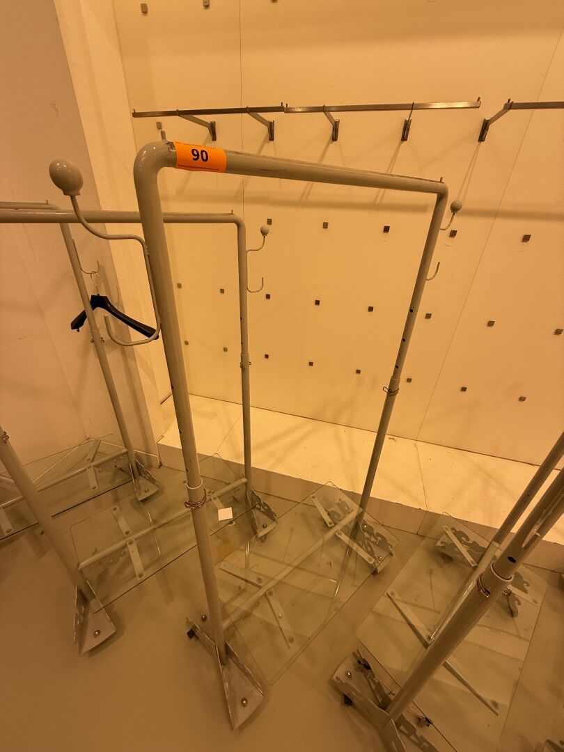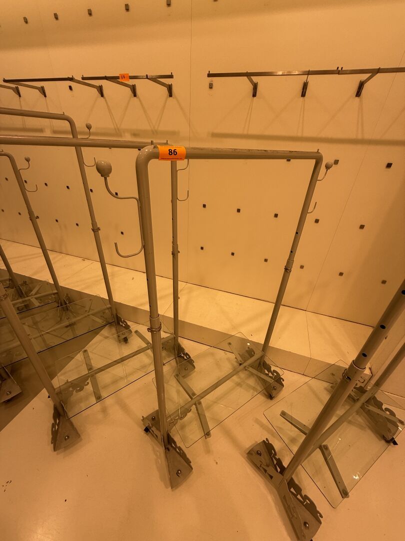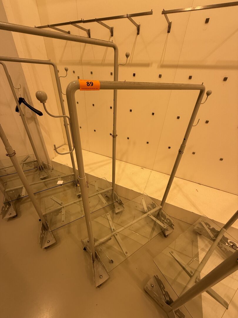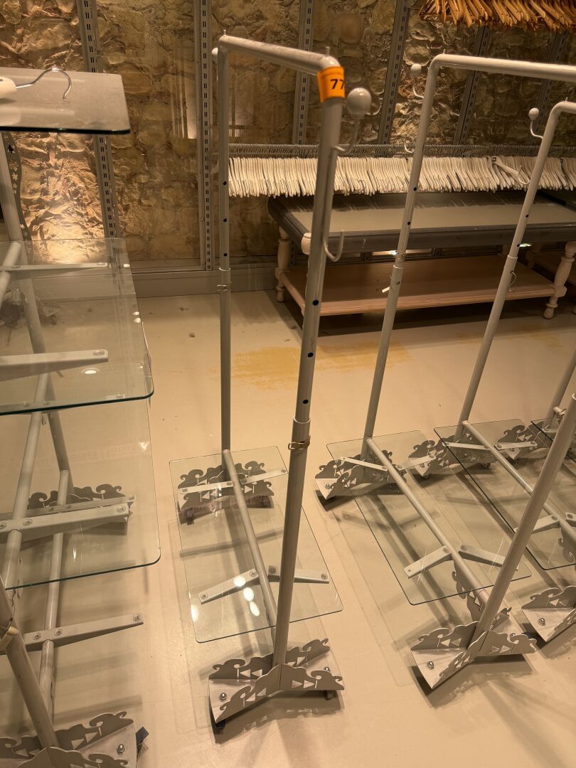 Présentoire du même modèle de forme rectangulaire présentant 3 portants, 1 étagère haute et 1 étagère basse en métal.