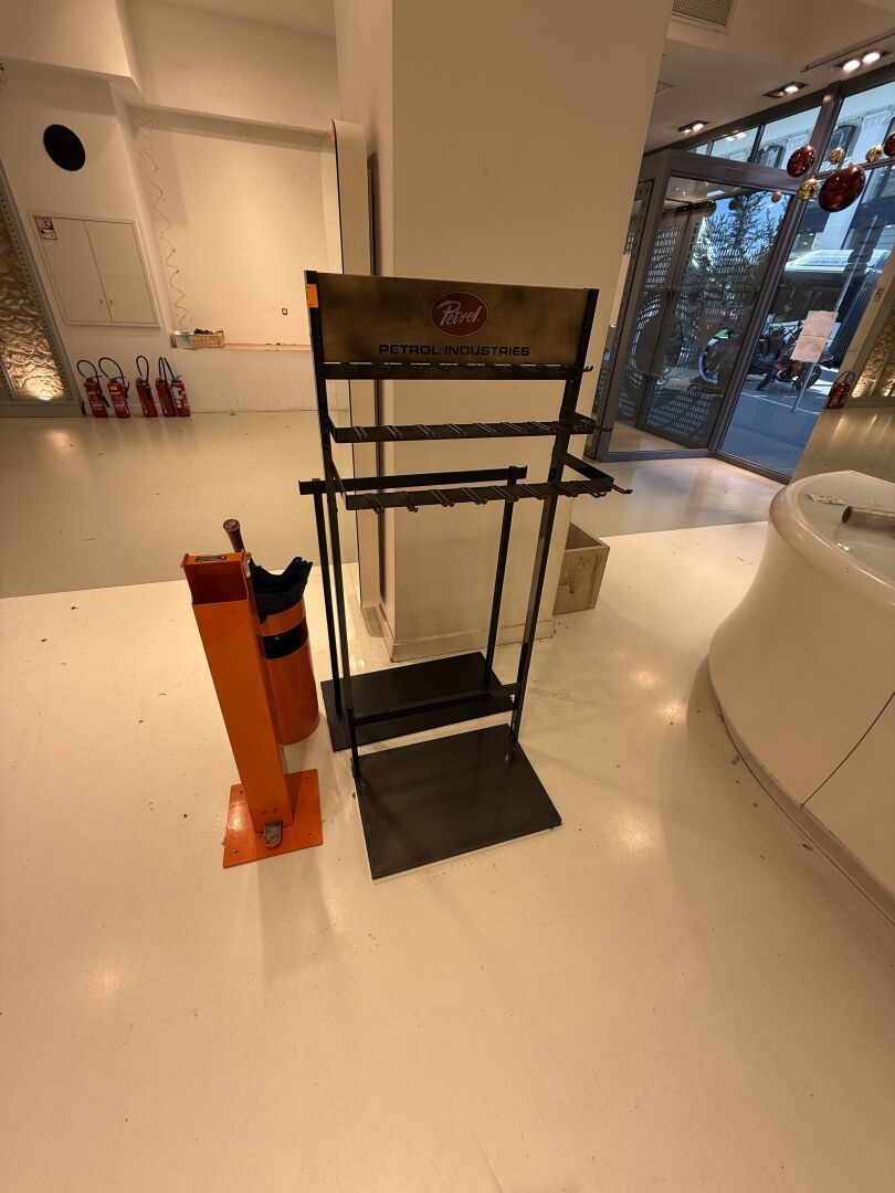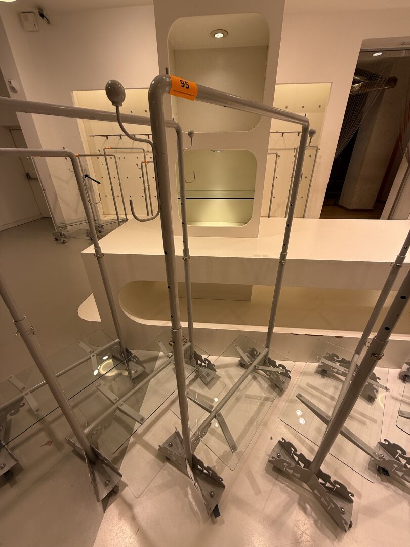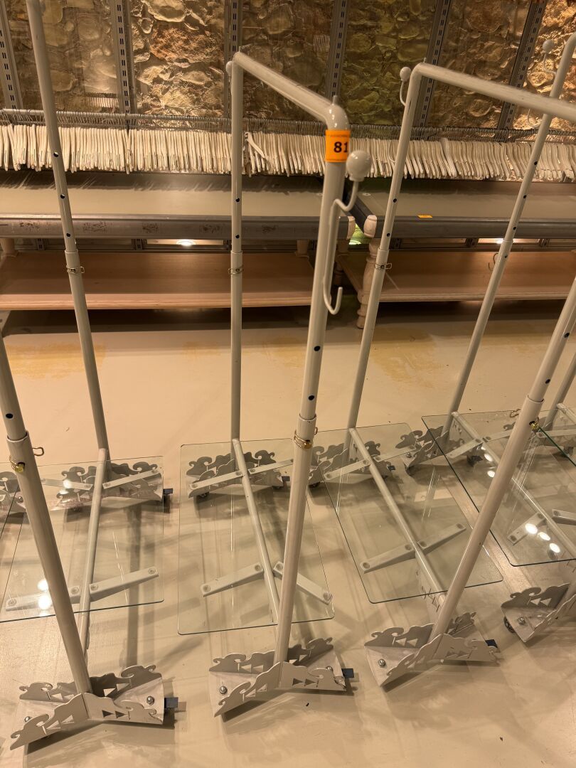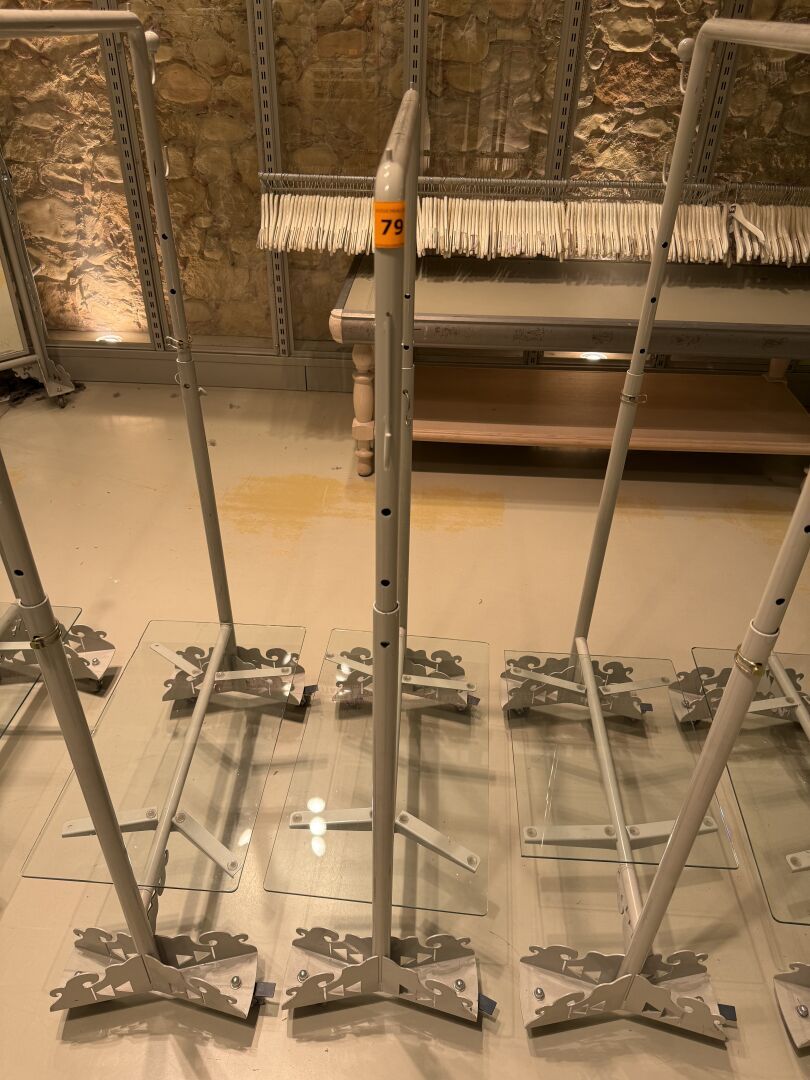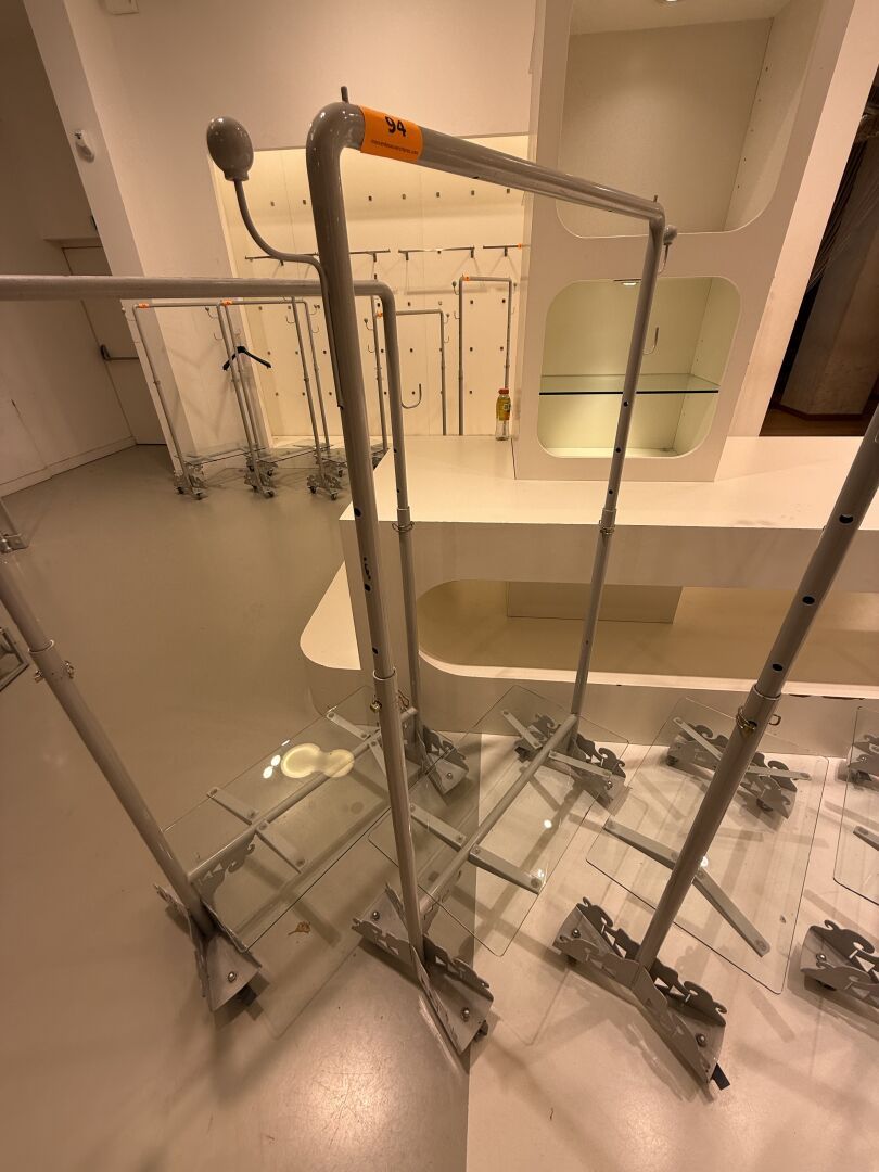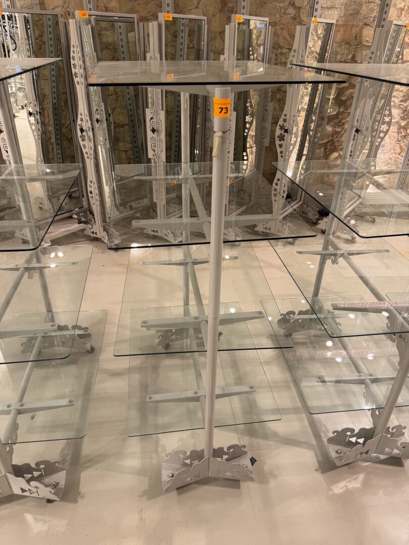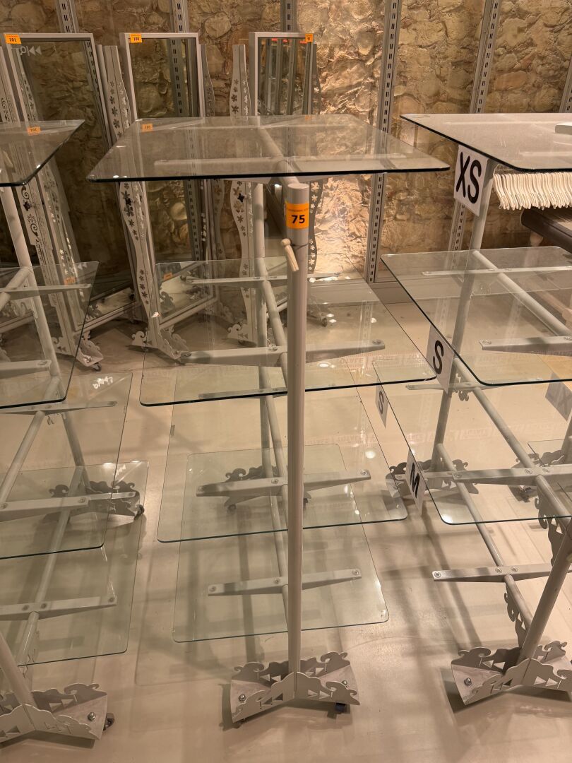 Présentoire du même modèle de forme rectangulaire présentant 3 portants, 1 étagère haute et 1 étagère basse en métal.