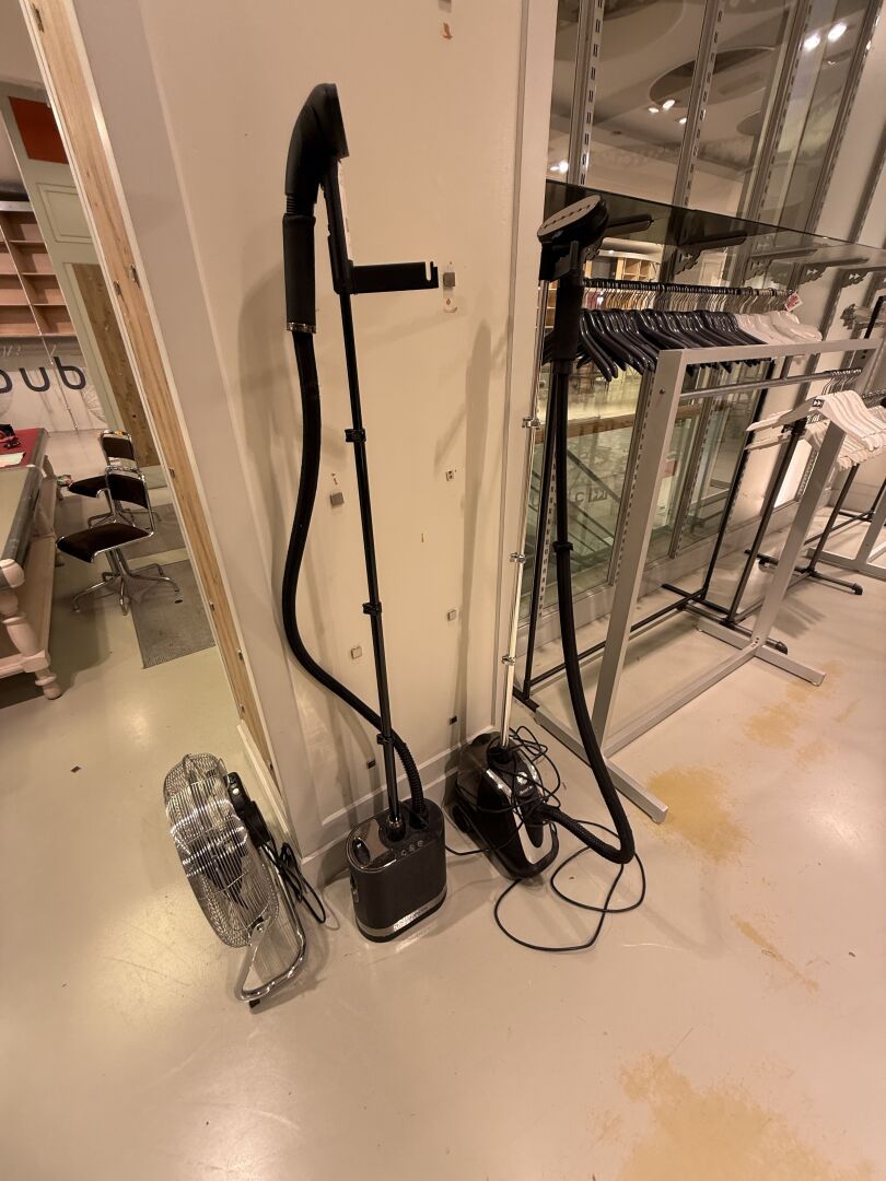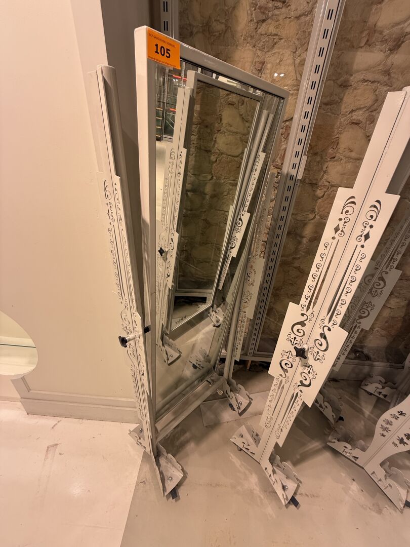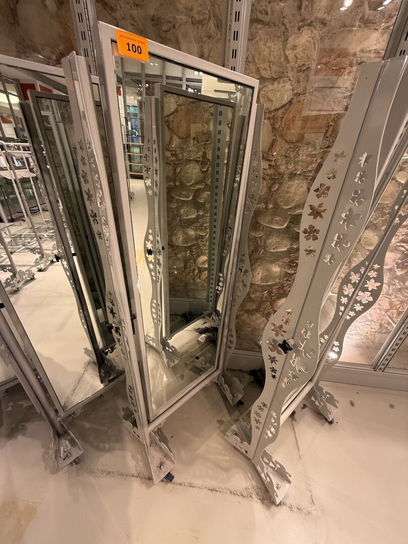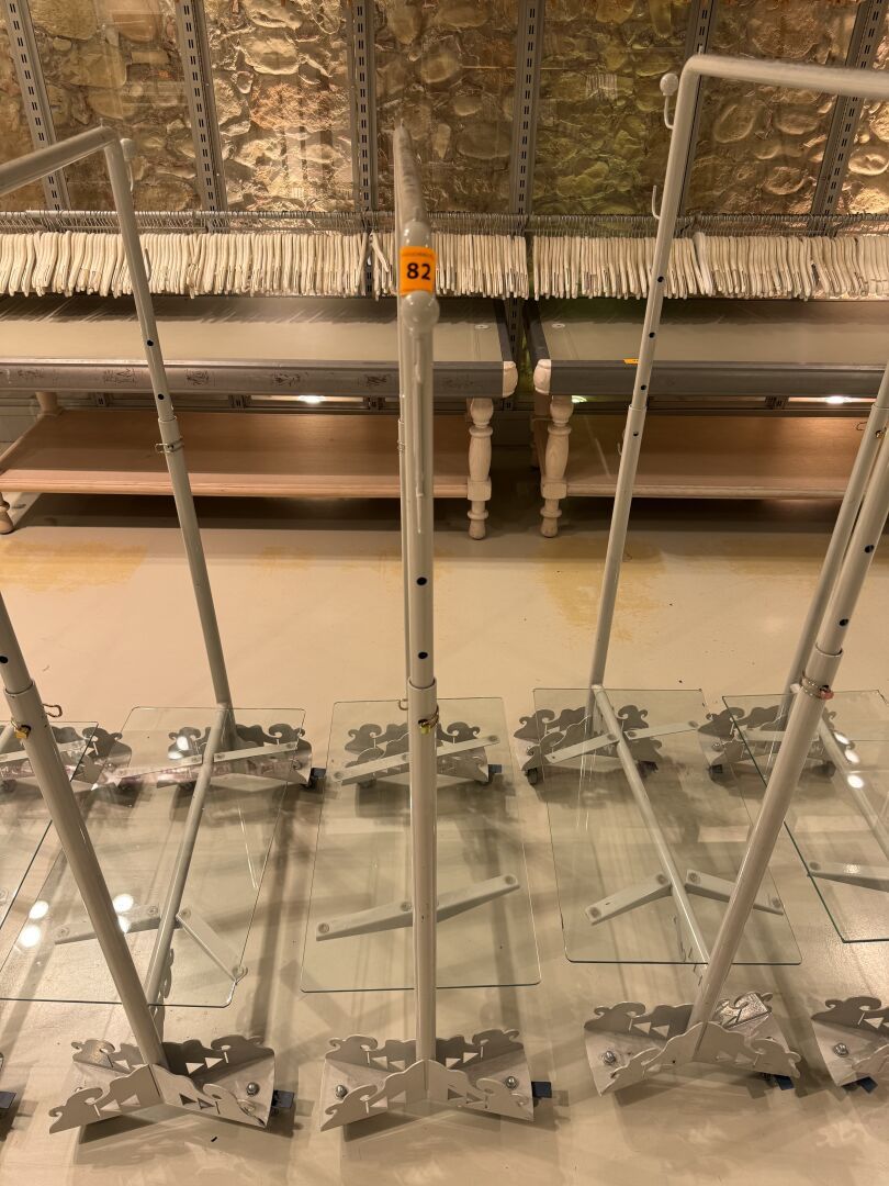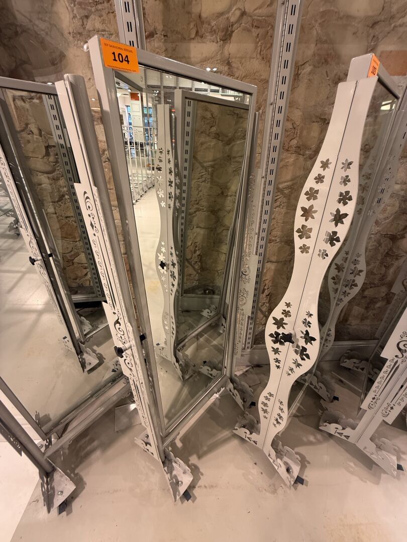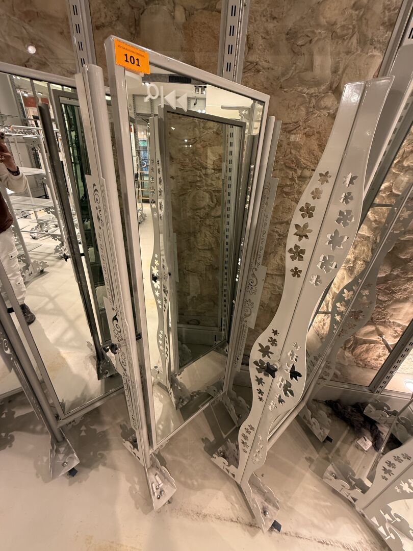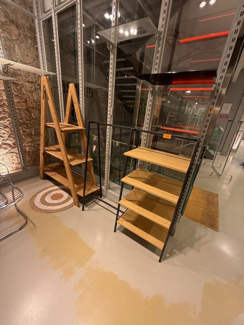 Présentoire du même modèle de forme rectangulaire présentant 3 portants, 1 étagère haute et 1 étagère basse en métal.