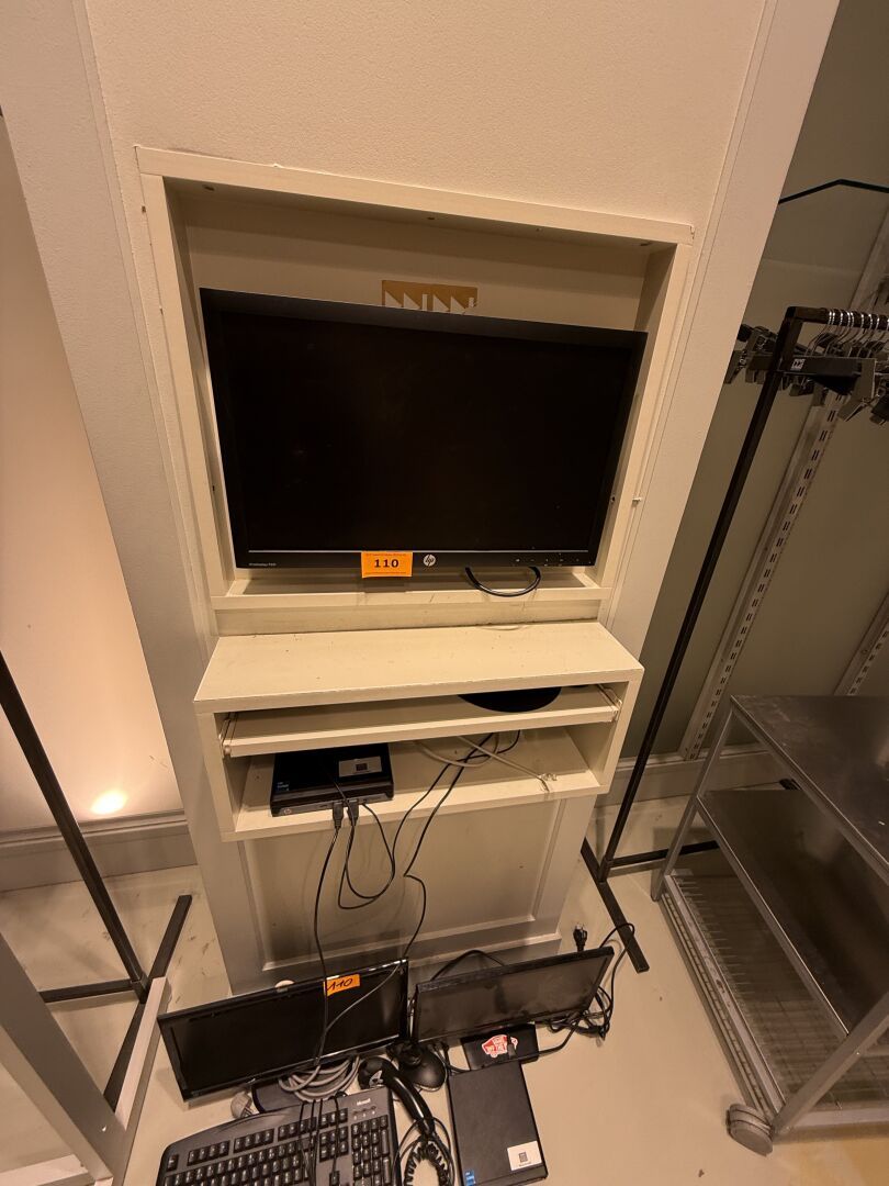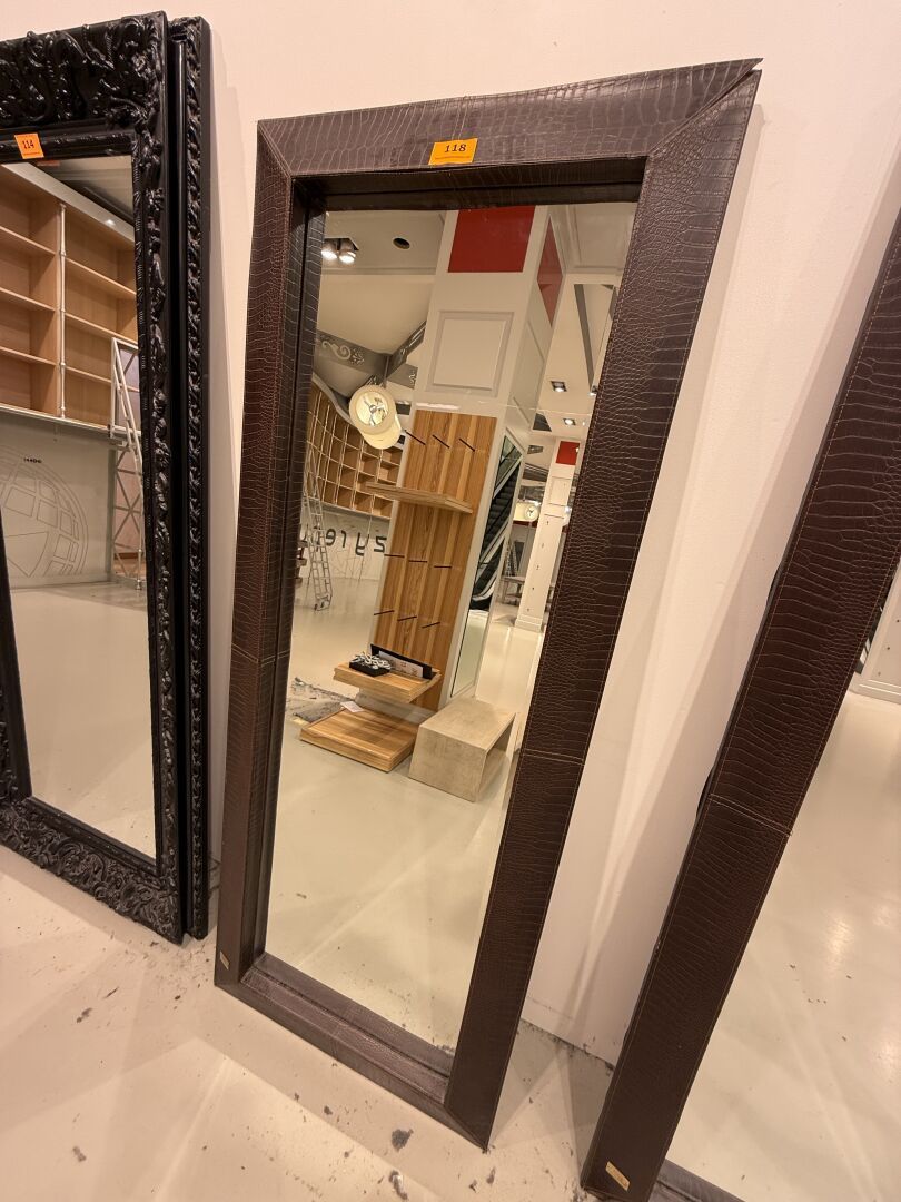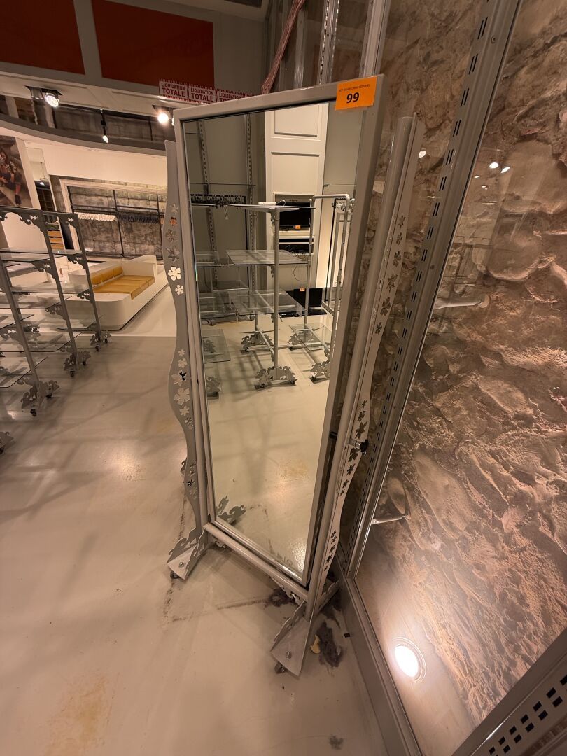 Présentoir en forme de cadre mouluré garni de tissu avec revers qui ouvre à une porte glace et présente 1 Portant et 1 étagère.