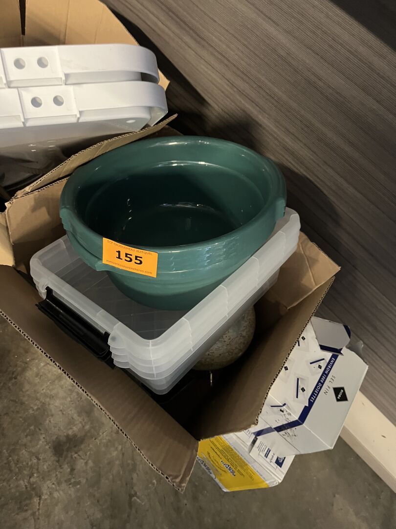 Ensemble de vaisselle, bacs plastique, couverts, ustensiles et batterie de cuisine.